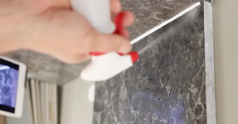 To ensure that the caulk adheres properly, wipe the top edge of the molding and ceiling with a damp rag to remove any dust or cobwebs. If grease or grime needs to be removed, use a mild detergent.