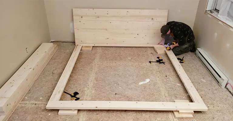 The last step is to create slats using the 1×3 lumber. You will place the slats cut to length on the cleat with a circular saw. The box spring and mattress can now be placed on the bed.